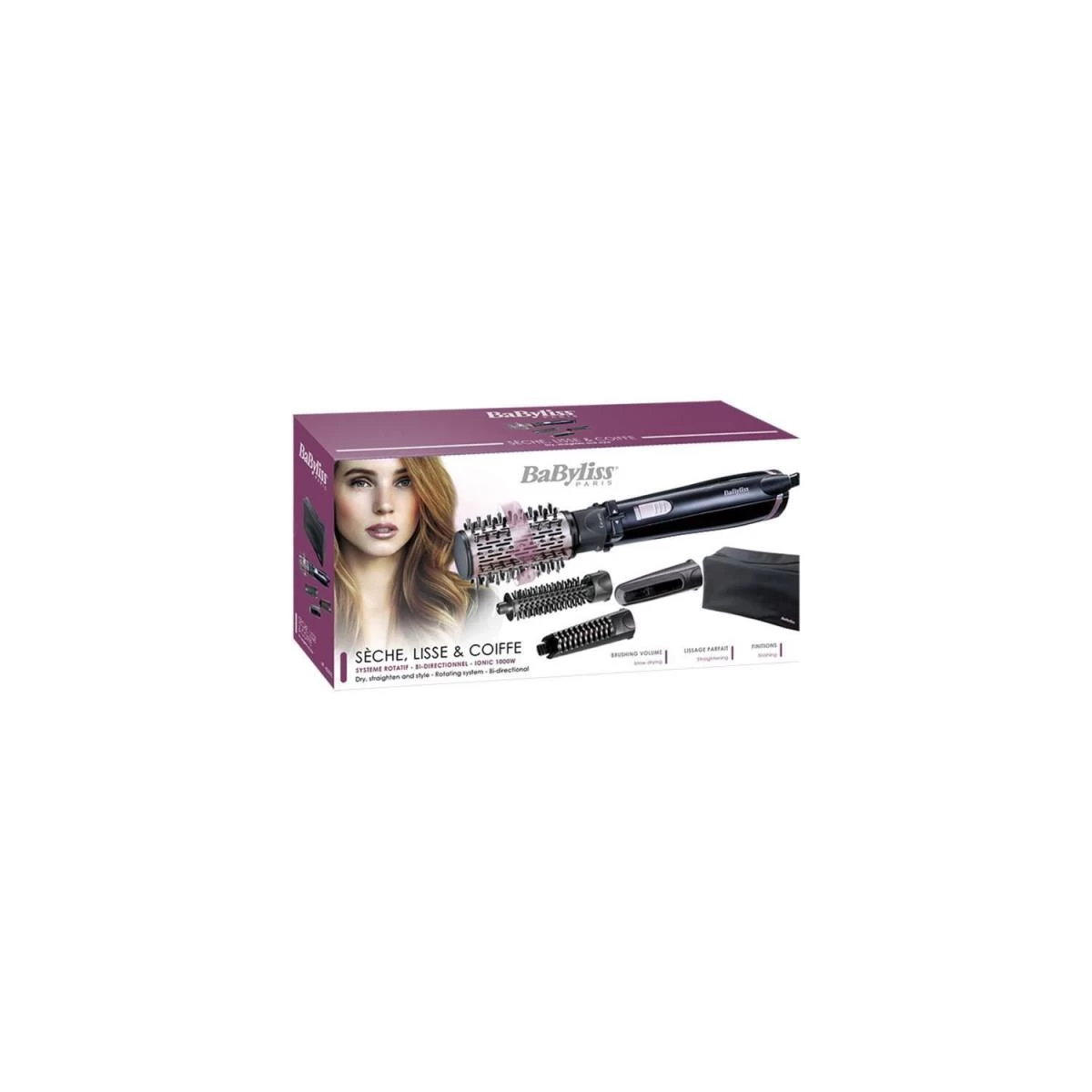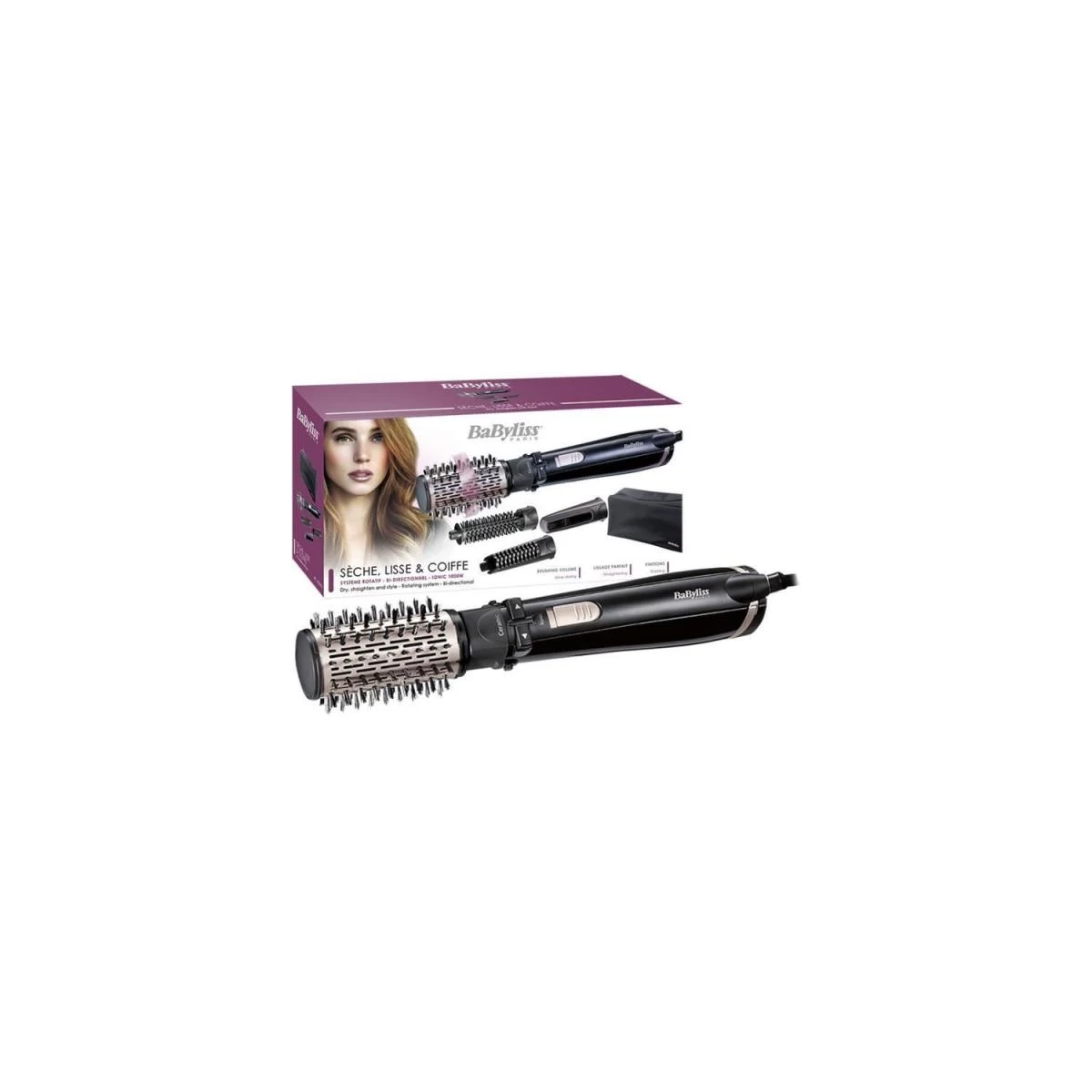 brosse soufflante rotative 1000w – as200e – Brosse soufflante rotative BaByliss AS200E avec kit complet pour une multitude de styles. Pour des brushing brillants, de belles boucles, du volume et de la souplesse. Livrée avec 4 accessoires : 1 brosse rotative 50 mm avec 2 sens de rotation pour un brushing volume, 1 brosse fixe 20 mm pour des finitions précises, 1 tête Beliss lissante pour un lissage parfait et un concentrateur. Fonction ionique pour des cheveux doux et sans frisottis. 2 vitesses / températures + air frais pour tous les types de cheveux et pour une coiffure fixée. – Type de produit : Brosse soufflante.