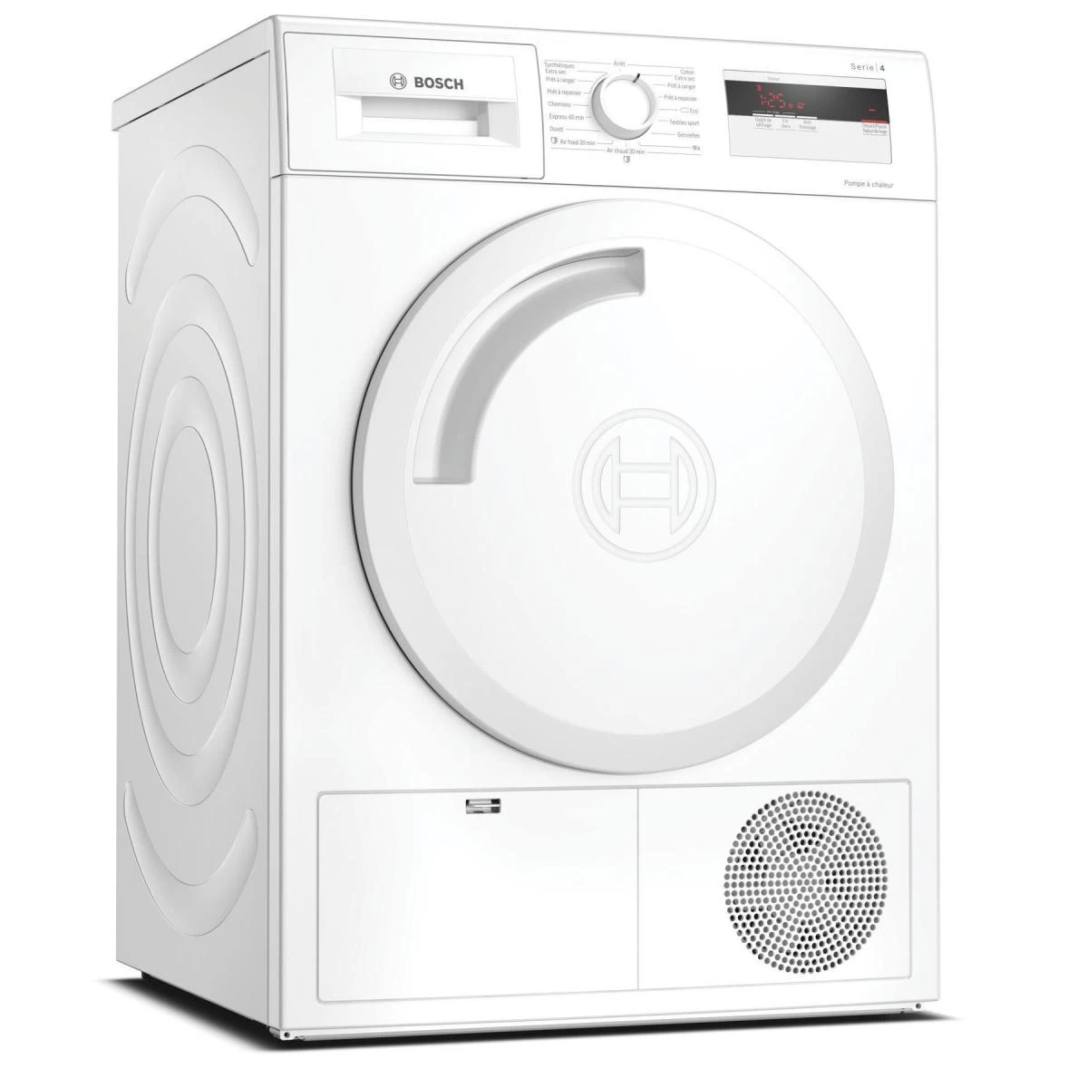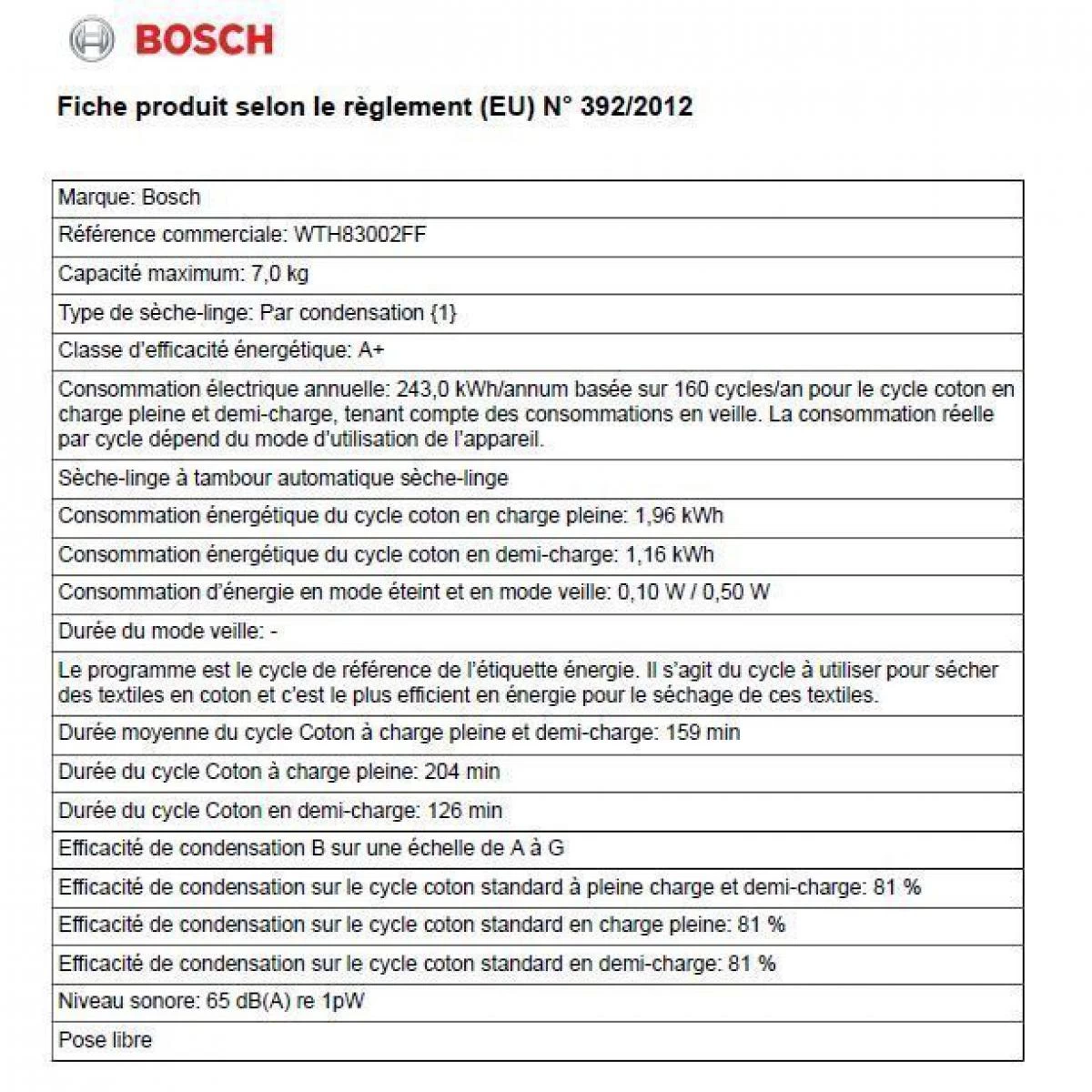 sèche-linge pompe à chaleur avec condenseur 60cm 7kg a+ blanc – wth83002ff – Sèche-linge Série 4 Bosch WTH83002FF pompe à chaleur : séchage parfait avec classe d’efficacité énergétique A+.Classe d’efficacité énergétique A+ : économique sur une échelle allant de A+++ à D.SensitiveDrying System : un séchage tout en douceur grâce à la structure unique du tambour.Niveau sonore 65dB : super silencieux.Filtre EasyClean : nettoyage facile du filtre du condenseur.AutoDry : le temps de séchage optimal : Les sèche-linge et lavante-séchante Bosch avec AutoDry vous permettent de sécher jusqu’à dix kilos de linge en douceur et au degré de séchage souhaité : prêt à repasser, prêt à ranger ou prêt à ranger extra. Les capteurs mesurent en permanence la température et l’humidité résiduelle et protègent ainsi votre linge des températures trop élevées et du séchage excessif.Sensitive Drying : séchage tout en douceur : Avec le système Sensitive Drying, le linge est séché par un léger flux d’air chaud venant de tous les côtés. Au lieu de rester plaqué contre le tambour, le linge est mélangé en souplesse par les aubes délicatement arrondies.Le meilleur programme pour vos vêtements de sport : Programme spécial pour un séchage précis et doux, conçu pour les vêtements de sport en extérieur mais aussi pour les vêtements en microfibres ou synthétiques. Avec ce programme, les vêtements sont séchés en douceur à température plus faible, et le séchage se fait par intervalle à la fin du programme pour un séchage parfait, même pour les vêtements avec plusieurs épaisseurs.Pour protéger les vêtements des températures trop élevées, les capteurs à l’intérieur du sèche-linge mesurent en permanence le taux d’humidité. Vous obtenez ainsi un linge parfaitement sec et en parfait état. – Type de produit : Sèche-linge condensation avec pompe à chaleur.