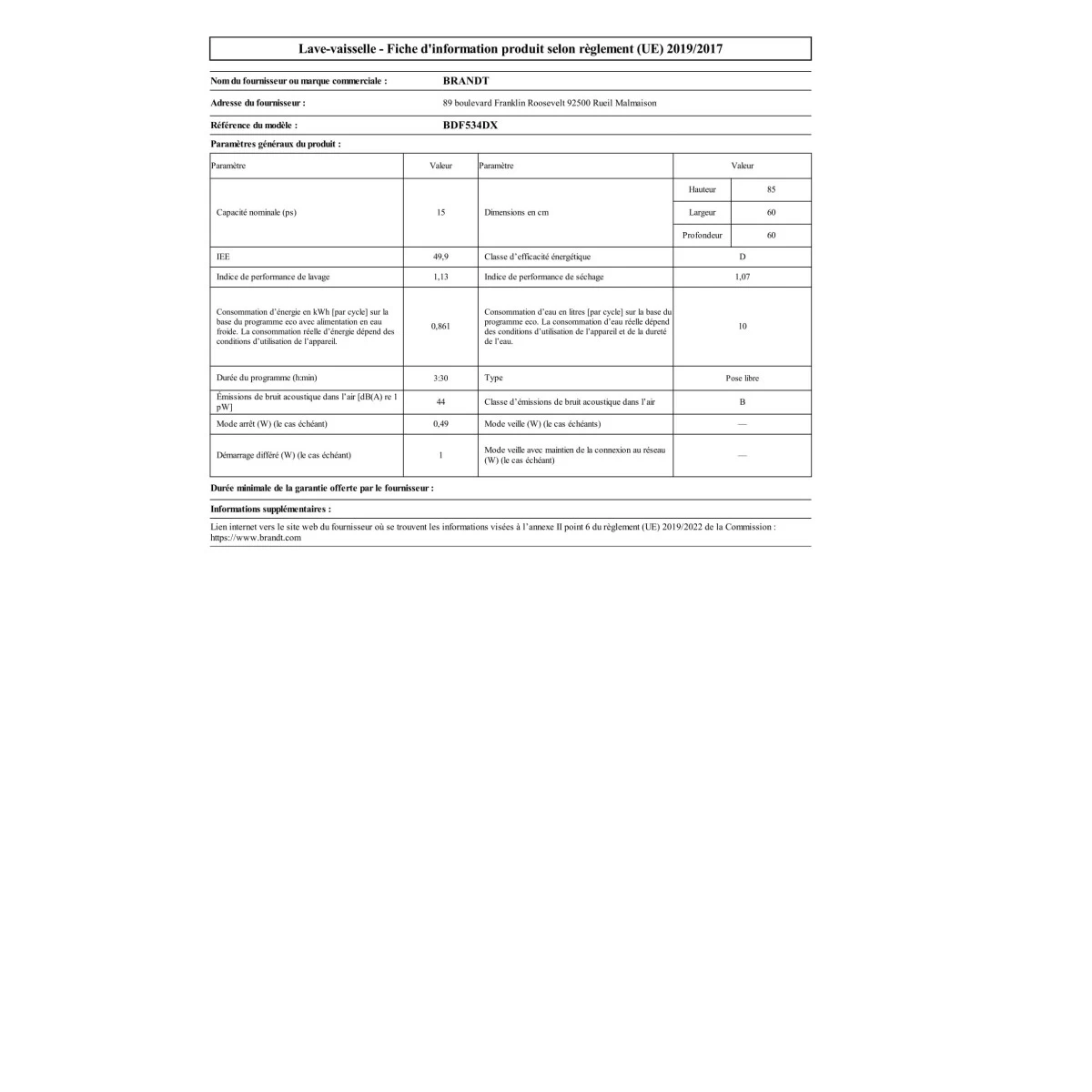 lave-vaisselle 60cm 15c 44db – bdf534dx – Lave-vaisselle Brandt BDF534DX avec Rapid Zone : Deux programmes courts 29min et 45min garantissant un lavage et séchage efficaces pour ne jamais être à court de vaisselle. Hygiène + : Un programme à haute température qui garantit une élimination plus efficace des bactéries. Ouverture de porte automatique : Pour un séchage naturel plus efficace, plus rapide et plus économique. – Type de produit : Lave-vaisselle 60 cm.