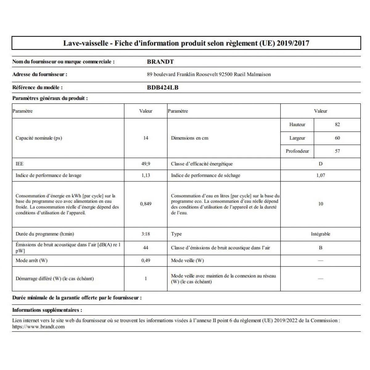 Points forts Brandt Lave vaisselle integrable 60 cm BDB424LB