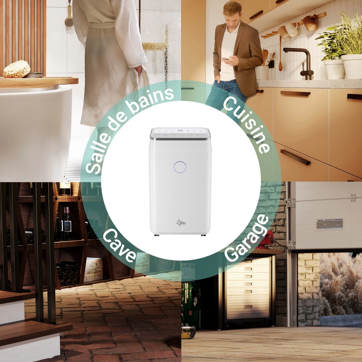 Le déshumidificateur d’air peut être utilisé sans connaissances particulières, ne nécessite aucun entretien et est livré à votre domicile prêt à être branché. Dès qu’il est connecté, vous pouvez régler l’humidité ambiante cible (30-80 %), la minuterie, le mode veille et la ventilation (2 niveaux de ventilation avec un débit d’air de 180 m³/h maximum) via l’écran LED.