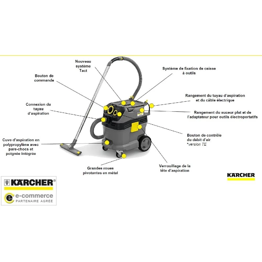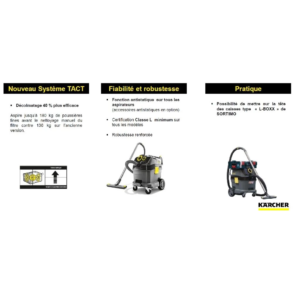 Points forts Karcher Karcher – Aspirateur eau et poussières 50L 1380W (décolmatage Tact Filter Clean) – NT 50/1 Tact Te L