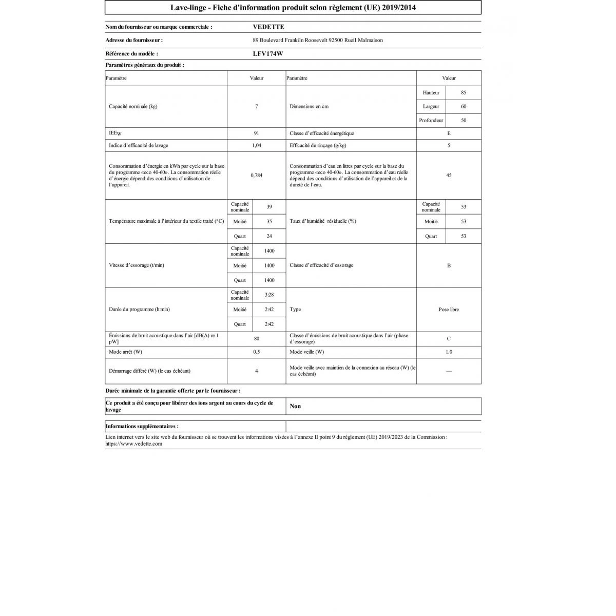 Points forts Vedette Lave linge frontal VEDETTE LFV174W
