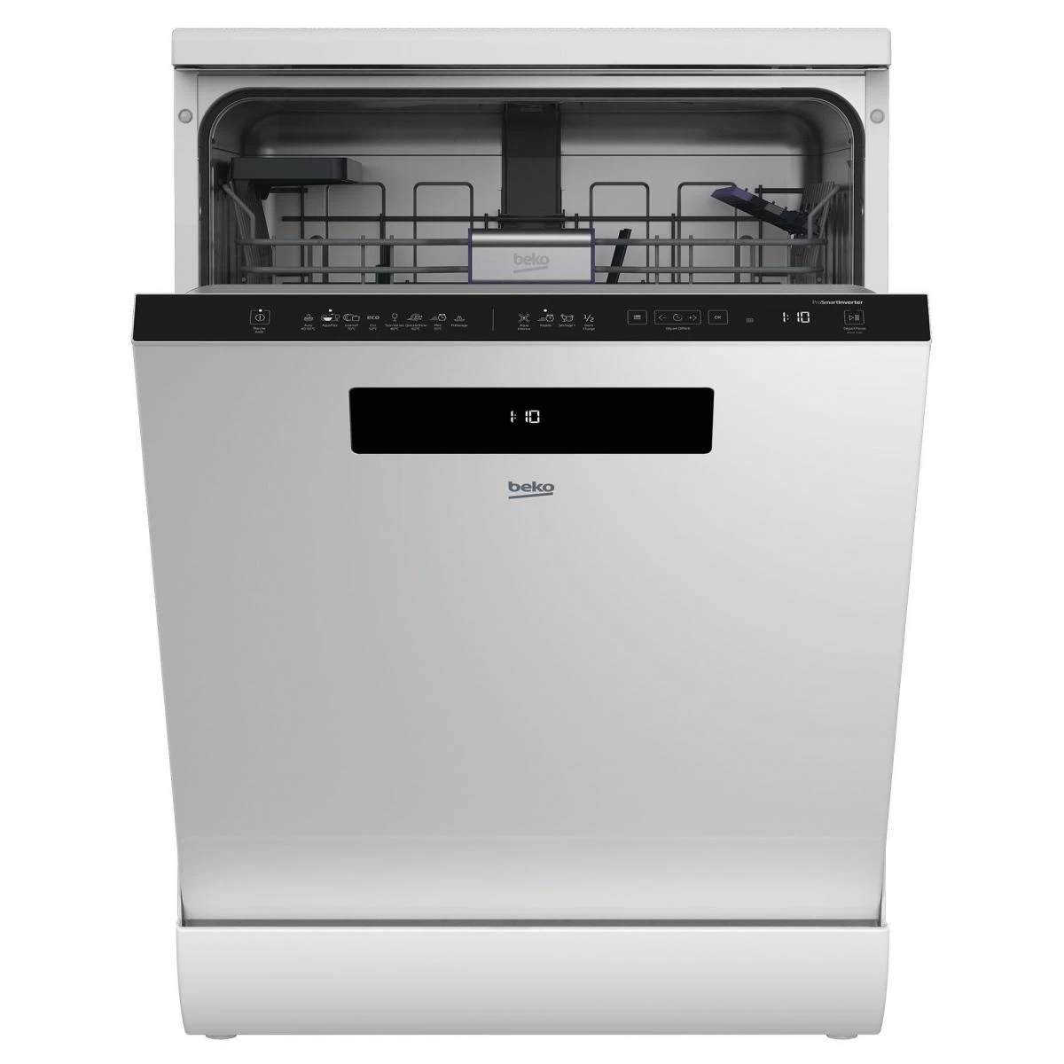 lave-vaisselle 60cm 14 couverts 46db – den48420wdos – Lave-vaisselle pose libre Beko DEN48420WDOS. AutoDose – Dosage lessiviel automatiqueJusqu’à un mois de lavage en toute tranquillité !En fonction du programme choisi et du niveau de salissure détecté, le lave-vaisselle est en mesure de délivrer la quantité exacte de détergent nécessaire afin d’éviter toute surconsommation tout en nettoyant la vaisselle efficacement.AquaIntenseEliminez toutes les salissuresAvec AquaIntense et son bras de lavage supplémentaire muni d?une hélice à 360°, obtenez des résultats de lavage 5 fois supérieurs à la normale, sans consommer plus d?eau.Moteur ProSmart InverterEliminez toutes les salissuresLe moteur à induction ProSmart Inverter n?a pas de balais, ce qui évite les frottements et les échauffements. Il est donc plus robuste, plus silencieux et plus efficace.Programme Soin VerresLavez vos verres de façon optimaleCe programme ajuste la pression de l?eau pour mieux préserver les verres. Testé en laboratoire, le programme Soin Verre permet aux verres de durer jusqu?à 20 fois plus longtemps.Départ différé 0-24 heuresLavez pendant le tarif heures creusesGrâce au départ différé 0-24 heures, vous pouvez mieux gérer votre emploi du temps et faire des économies en bénéficiant des tarifications heures creuses. – Nombre couverts : 14.