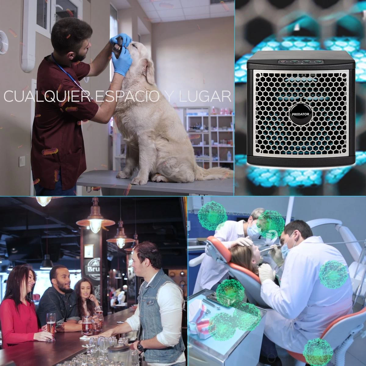 - Efficace jusqu’à 140m² : Il est efficace dans les pièces jusqu’à 140m² et peut donc être utilisé 24/7 dans les maisons, bureaux, pubs, restaurants, cliniques vétérinaires, dentistes, écoles, installations sportives, hôtels… Il peut être utilisé en notre présence et en présence de nos animaux domestiques. Il remplace la désinfection manuelle des surfaces à l’aide de liquides et de sprays chimiques.