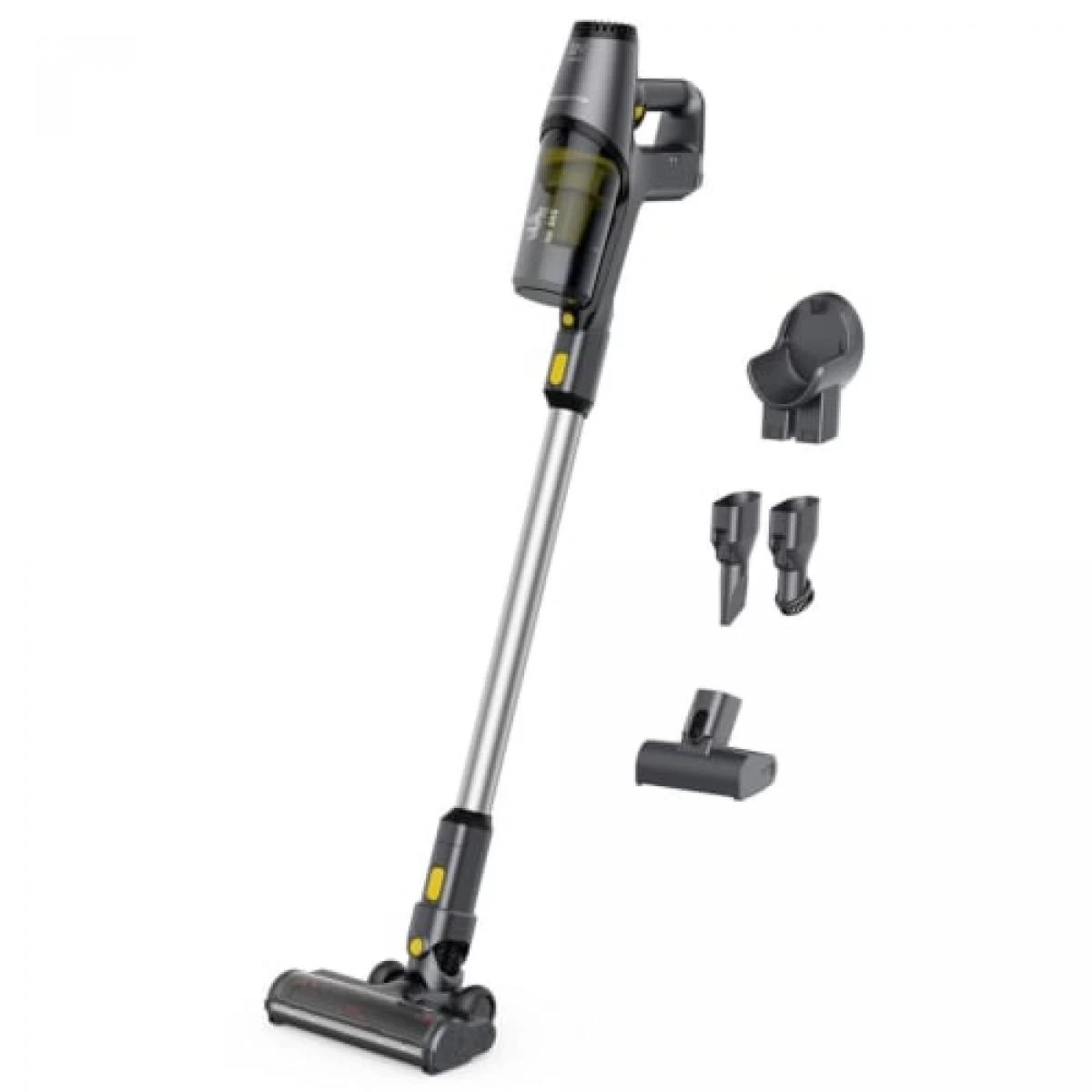 - Nombreux accessoires : support mural avec possibilité de rangement de 2 accessoires, suceur plat, mini brosse turbo (poils d’animaux), brosse rembourrée, brosse universelle avec LED.