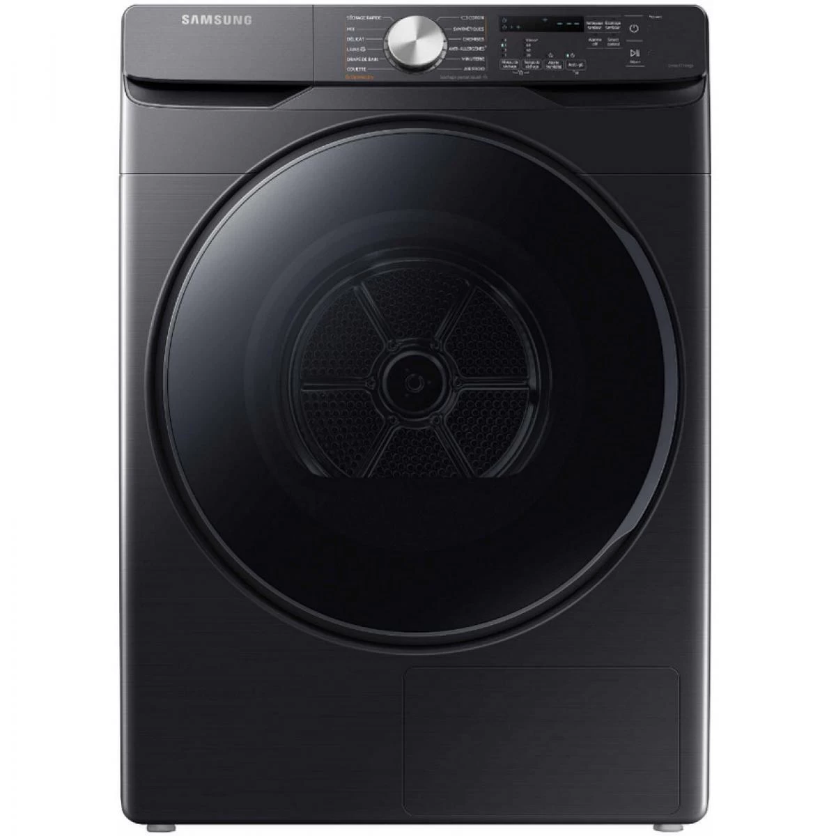 sèche-linge pompe à chaleur avec condenseur 60cm 16kg noir mat – dv16t8520bv – Ce sèche-linge pompe à chaleur hybride Samsung DV16T8520BV associe capacité, praticité et soin du linge. Technologie pompe à chaleur hybride HybridHeatPump : En commençant par préchauffer l’air à une température optimale à l’aide d’une résistance, le sèche-linge à pompe à chaleur hybride permet un séchage plus rapide et des économies d’énergie. La technologie « Pompe à chaleur », prend ensuite le relai et recycle l’air chaud pour maintenir une température optimale mais inférieure à celle d’un sèche-linge à condensation classique, vous permettant ainsi de réaliser des économies d’énergie tout en respectant votre linge. Optimal Dry : L’arrêt du séchage est automatique grâce au capteur d’humidité, ce qui permet des économies d’énergies et un plus grand soin du linge. Filtre 2-en-1 : Performance et entretien optimisés grâce à un nouveau filtre dans la porte qui capte davantage de fibres textiles. Celui-ci permet de supprimer le filtre du condenseur, pour faciliter l’entretien de l’appareil. Ecran Led bleues, touches sensitives : Doté d’un bandeau de contrôle et équipé de LED bleues, ce lave-linge présente un design raffiné pour s’harmoniser avec votre intérieur. Ainsi il est particulièrement facile et agréable à programmer. – Type de produit : Sèche-linge frontal.