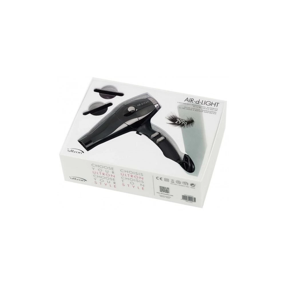 Sèche cheveux ultra Léger D-Light, le plus léger au monde avec ses 299 GrsSèche-cheveux professionnel Ultron Air-d-Light à moteur électronique sans balais perfectionné. Conçu pour sécher les cheveux rapidement en réduisant les dommages causés par la chaleur.Débit d’air contrôlé pour un séchage rapide des cheveux plus épais.Son corps ultra léger facilite la manipulation et accroît le confort en cours de coiffage. Les 3 réglages de la température et les 2 réglages de la vitesse ainsi que les 2 embouts amovibles vous laissent la maîtrise totale du séchage.Touche Flash Air Froid2 Vitesses et 3 températuresDébit d’air 156 m²/hPoids : 299 Grs2 embouts sifflets inclusGarantie 1 An