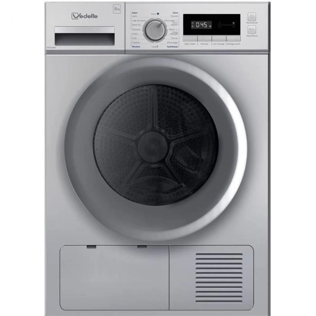 Seche-linge pompe a chaleur VEDETTE VSF218HS – 8kg – L60cm – Silver – 69dB – Pose libre – Tambour Inox 125L – Habillage hublot Silver – 16 programmes – Départ diffété 24h – Classe A++ – Programmation expert – Eclairage – 750W – Voyant nettoyage filtre, réservoir plein – Affichage temps restant