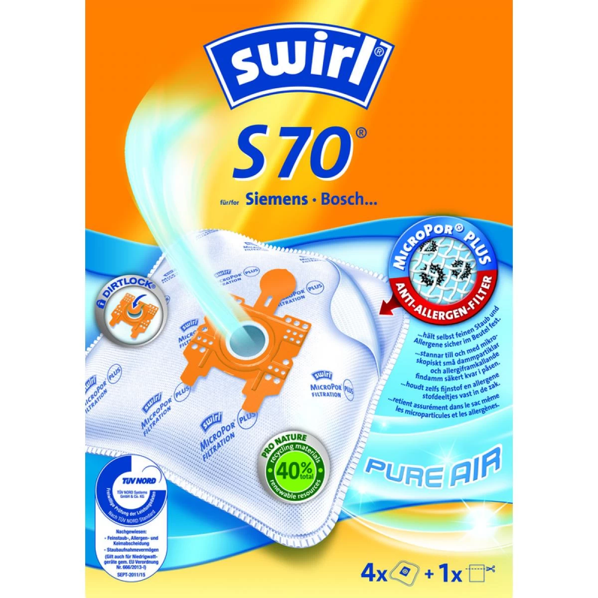 swirl Sac d’aspirateur S 70, avec filtre MicroporPlus en tissu microfibre, avec fermeture, pour une aspiration maximale, rertient les poussières fines allergènes contenu: 4 sacs d’aspirateur + 1 filtre universel (S70) adapté pour: Siemens bigbag 3L / VS 01E0000…9999 Super SX / VS 01G0000…9999 Smily Bosch arriva BSG1000…1999 / bigbag 3L / BSN0000…9999 Typ K / privilège / Profilo / Ufesa