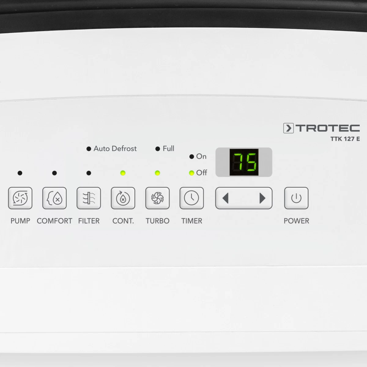 Déshumidificateur TTK 127 E pour 375 m³/150 m² max. à capacité de déshumidification max. de 50 l/24 h. Puissant modèle programmable équipé d’un sélecteur d’hygrométrie et d’un ventilateur à deux vitesses permettant de déshumidifier l’air plus ou moins vite en fonction des besoins.